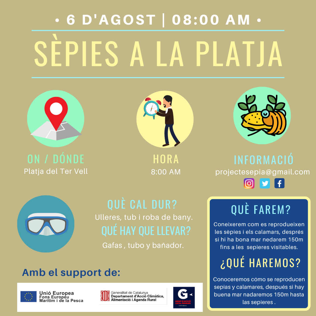 Cansat de anar a la platja només a pendre el sol? Vine a conèixer el Projecte Sèpia, desprès d'aquesta jornada veuràs el mar amb altres ulls. Desprès, si la mar ho permet nedarem fins a les sepieres visitables de l'Escala. ?21 de juliol 8:00 ?L'Escala ?Activitat...
